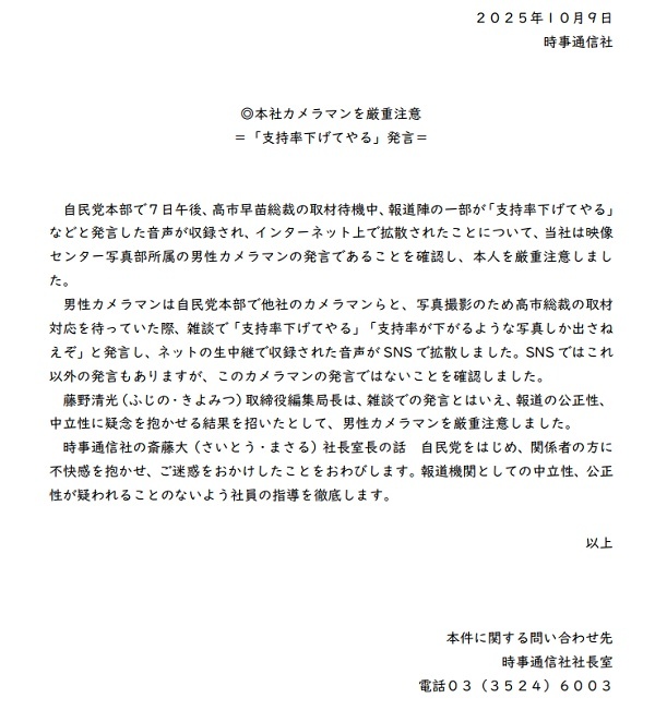 時事通信がカメラマンの「支持率下げてやる」発言を認め、厳重注意処分を発表。