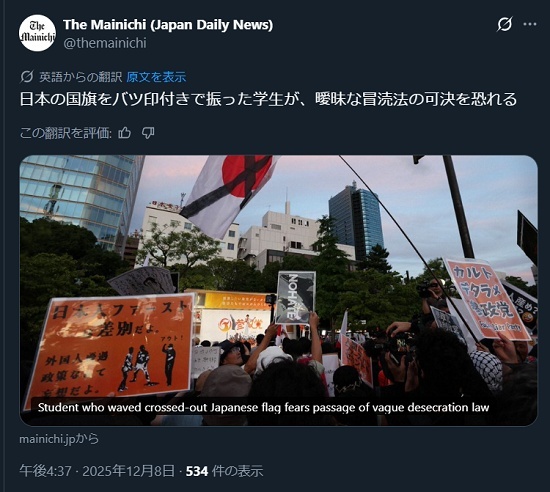コメント 毎日新聞、英語発信「日本の国旗をバツ印付きで振った学生が、曖昧な冒涜法の可決を恐れる」