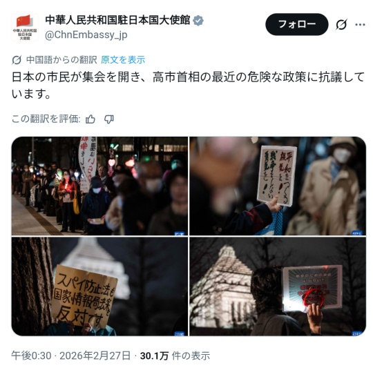 — 中華人民共和国駐日本国大使館 (@ChnEmbassy_jp) February 27, 2026